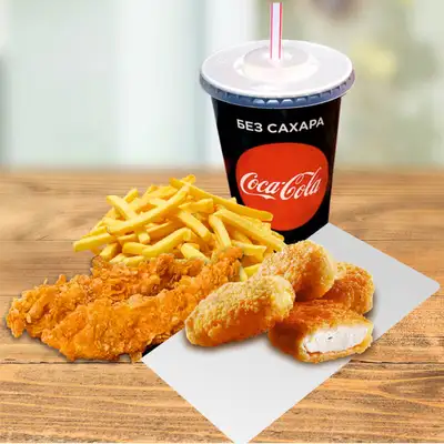 Картошка фри, хрустящие стрипсы, нежные куриные наггетсы, напиток на выбор: чай, кофе, кола 0,3л.